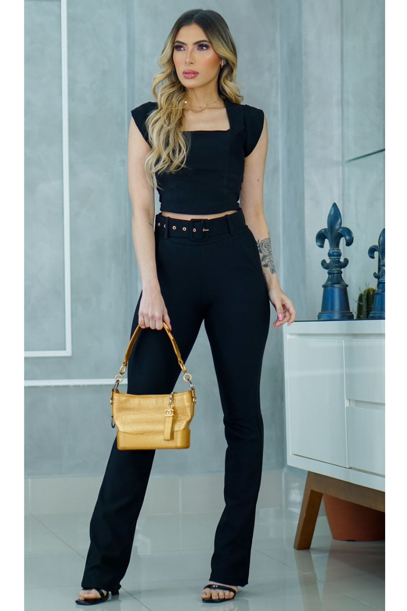 Calça Semi Flare com Cinto Tecido Montaria de Poliamida - Preto